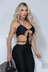 Este macacão preto possui um design sensual e moderno, com recortes estratégicos na cintura e no busto, conectados por argolas metálicas. A peça ajustada valoriza as curvas, enquanto as alças finas adicionam um toque delicado ao visual sofisticado.