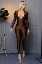 Macacão em cirrê marrom com leve brilho e estampa animal print em alto-relevo. Modelagem justa ao corpo, com decote profundo frontal e costas totalmente abertas, valorizando a silhueta. Ideal para looks ousados e sofisticados.