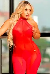 Macacão vermelho justo com tule e gola alta, que valoriza o corpo e transmite poder e sensualidade. Ideal para produções marcantes e cheias de atitude.