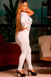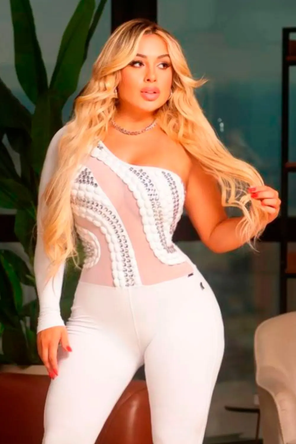 Macacão branco de um ombro só com manga longa, confeccionado em tecido justo que modela o corpo. Possui detalhes em tule e aplicações de pedrarias que adicionam brilho e sofisticação. Peça moderna e elegante, ideal para eventos noturnos e produções de destaque.