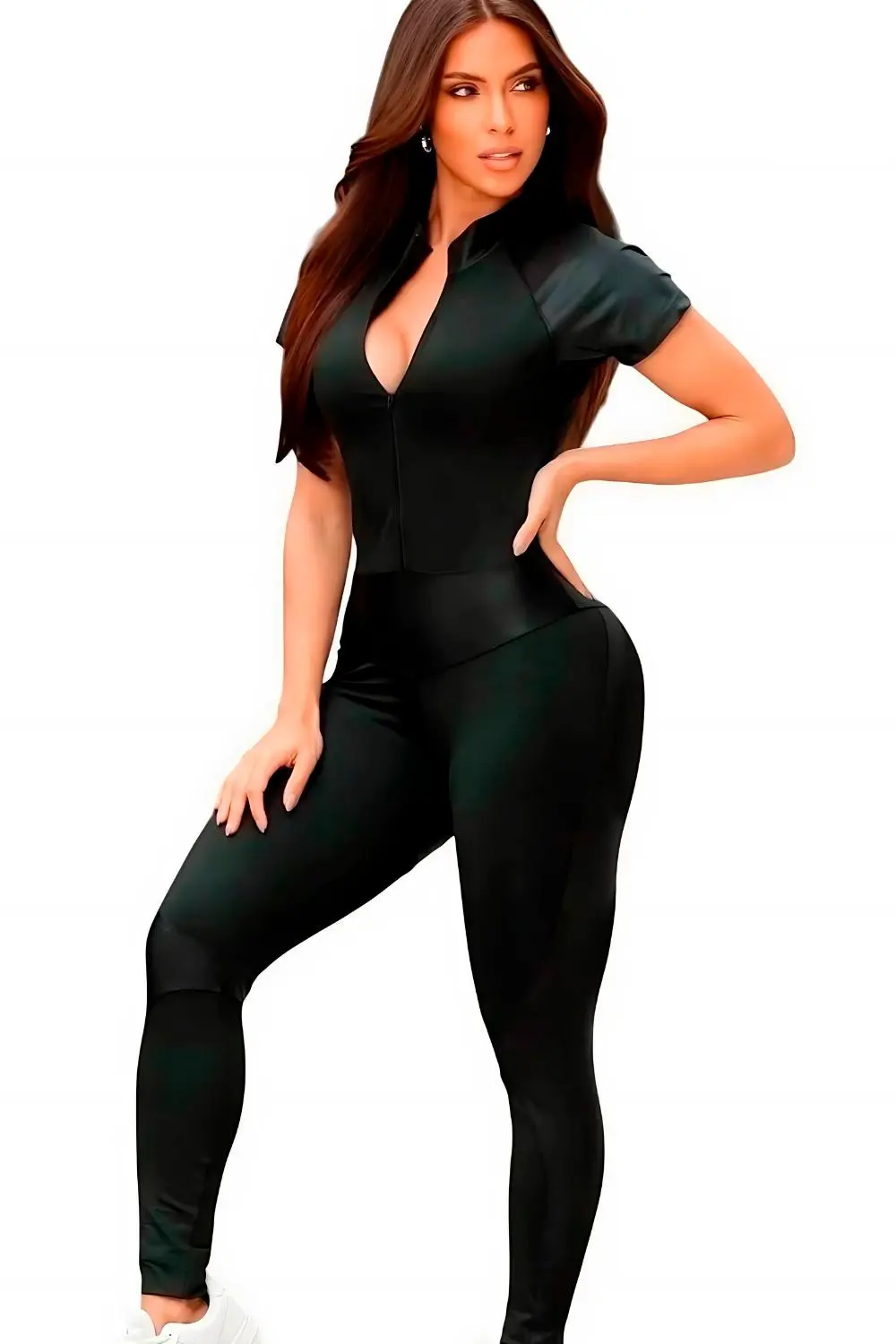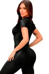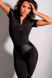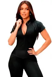Macacão justo e elegante, com um design moderno que combina mangas curtas, zíper frontal e detalhes em tecido brilhante em áreas estratégicas, como os ombros e as pernas. A peça valoriza a silhueta, oferecendo sofisticação e estilo atlético, perfeita para ocasiões casuais ou esportivas.