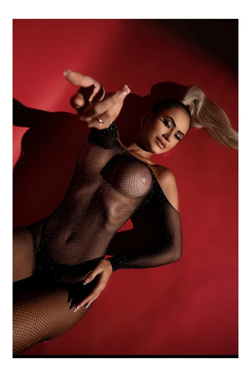 Macacão em tule transparente com aplicação de microcristais, modelagem completa e manga longa. A peça combina sensualidade e brilho na medida certa, com decote ombro a ombro e recortes estratégicos que valorizam as curvas. Ideal para ocasiões noturnas ou produções ousadas com atitude.