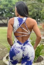 Características: O produto é um macacão com decote e pequena sobreposição de tecido no busto, além de estampa em aquarela azul e branca. Possui empina bumbum.