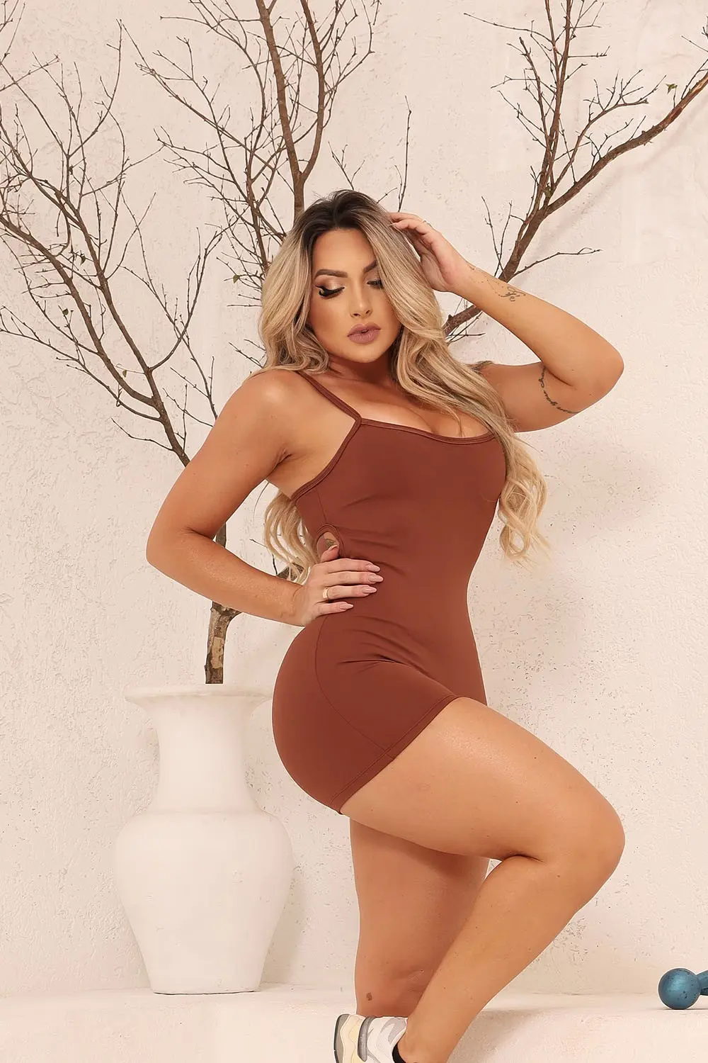 Macaquinho marrom de alças muito confortável com recorte nas costas e empina bumbum.