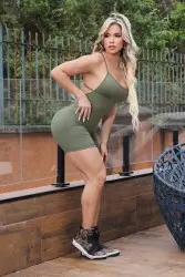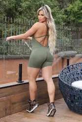 Macaquinho fitness verde com abertura e detalhes trançados nas costas. Esta peça combina estilo e conforto, perfeita para os seus treinos, proporcionando um visual elegante e funcional.
