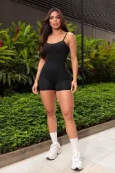 Macaquinho fitness preto com design elegante e alças finas, realça as curvas com conforto e estilo. Ideal para treinos ou looks casuais.