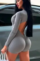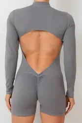 Macacão curto de manga longa na cor cinza, com design minimalista e ajuste justo ao corpo. Possui zíper frontal que permite diferentes níveis de abertura e gola alta para um toque sofisticado. O tecido elástico oferece conforto e liberdade de movimento, ideal para treinos ou looks casuais modernos.
