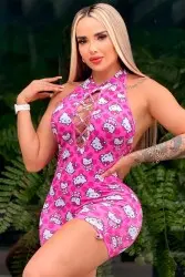 Macaquinho estampado Hello Kitty, confeccionado em tecido leve e ajustável ao corpo. Possui decote trançado frontal e costas abertas, combinando conforto e sensualidade em uma peça moderna e divertida.