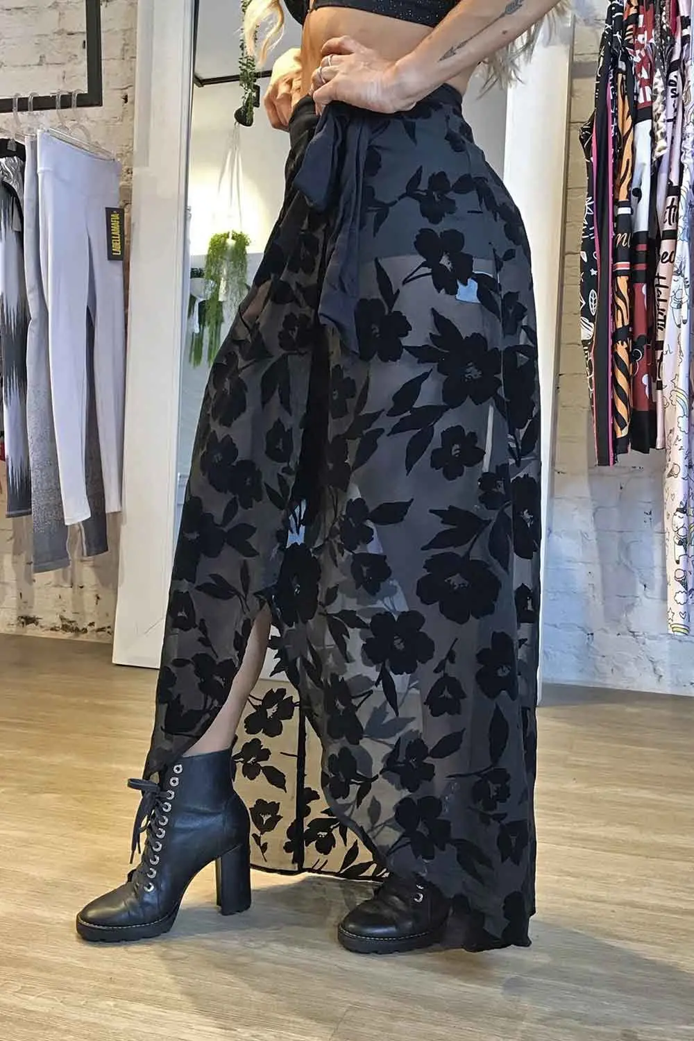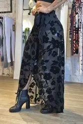 Características: Saia midi feita em tecido preto transparente com veludo nas flores.