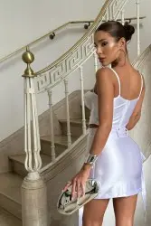 Saia curta e justa, feita de tecido acetinado, que reflete a luz, dando um acabamento brilhante e elegante. O design apresenta bolsos laterais com fechos decorativos e detalhes modernos, o que adiciona um toque utilitário ao estilo glamouroso. A saia tem um caimento estruturado que combina perfeitamente com o top no mesmo tecido, criando um visual sofisticado e sensual.