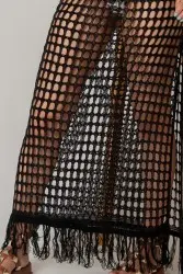 Saída de praia em crochê com toque boho e detalhe de franjas na barra. Perfeita para sobrepor seu biquíni e trazer um visual despojado e estiloso para os dias de sol.