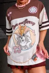 T-Shirts feminina oversized em algodão, com estampa de Tom & Jerry, detalhes em listras nas mangas e sigla "TJ". Confortável e estilosa, ideal para looks casuais.