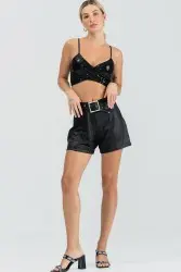 O top possui um design elegante e sofisticado, com um tom preto clássico que é sempre uma escolha atemporal e elegante. A peça é adornada com lantejoulas pretas, que refletem a luz e criam um efeito cintilante deslumbrante. As lantejoulas são costuradas de forma segura, garantindo que permaneçam no lugar e criem um visual impecável.