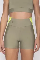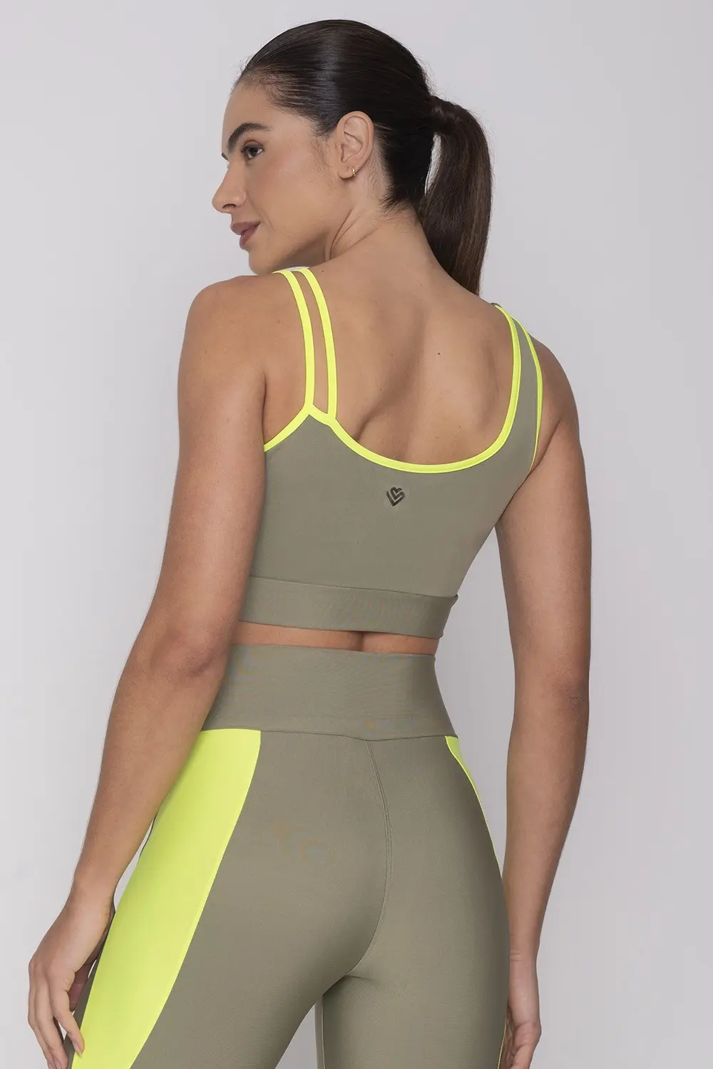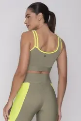 Top fitness verde com detalhes neon na gola e nas alças. As alças são irregulares, trazendo um ar moderno e descolado para o look e transformando em uma aposta casual refinada.