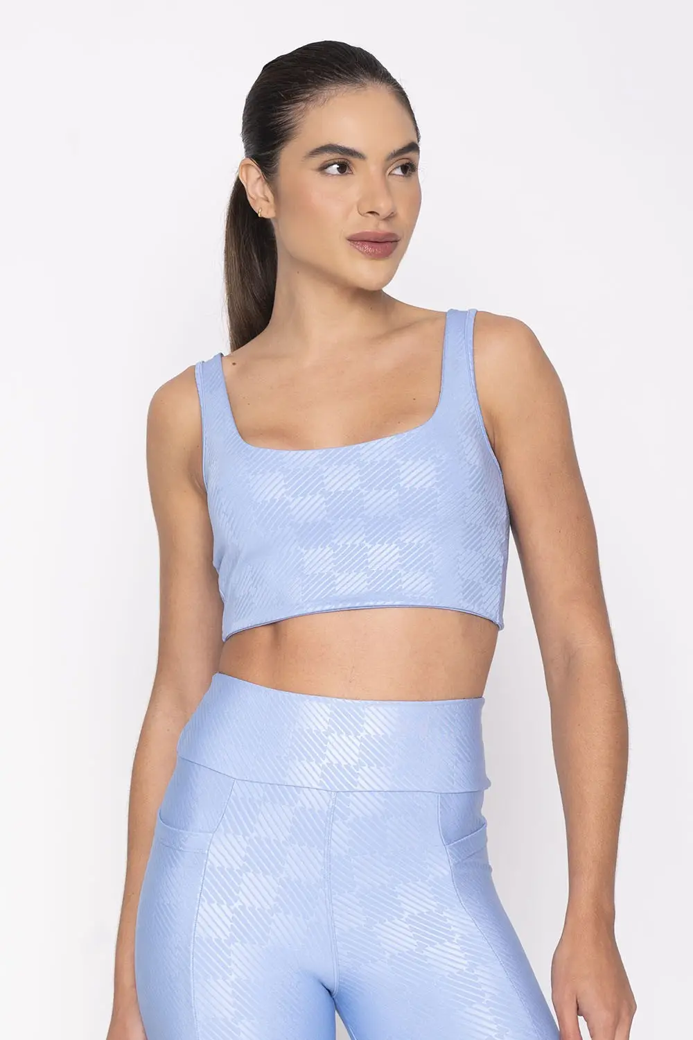 Top azul claro com alças largas e decote quadrado. O tecido possui um padrão sutil que dá um toque diferenciado e moderno ao look, além de oferecer suporte e conforto para atividades físicas. As costas são abertas e com um detalhe torcido que traz muito mais charme.