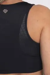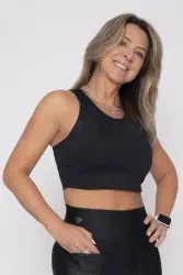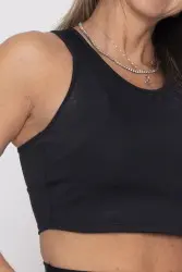 Top fitness preto com costas nadador, garantindo conforto e sustentação durante atividades físicas. Possui detalhes texturizados nas laterais, conferindo um toque moderno e elegante ao design. Confeccionado em tecido elástico e respirável, é perfeito para treinos ou composições casuais esportivas. Discreto e funcional, combina estilo e praticidade.