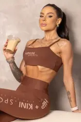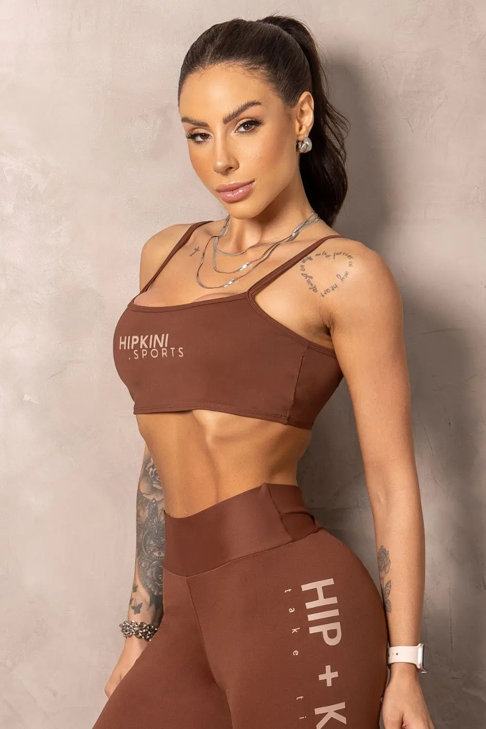 Top esportivo na cor marrom, com design moderno e elegante. Possui alças finas ajustáveis e decote reto, proporcionando sustentação leve com um toque sofisticado. A peça conta com recorte no busto que realça a modelagem e acabamento canelado na barra para maior firmeza ao vestir. Estampa frontal discreta com a frase “Hipkini Sports”, reforçando o estilo fitness com atitude. Ideal para treinos ou composições casuais com conforto e estilo.