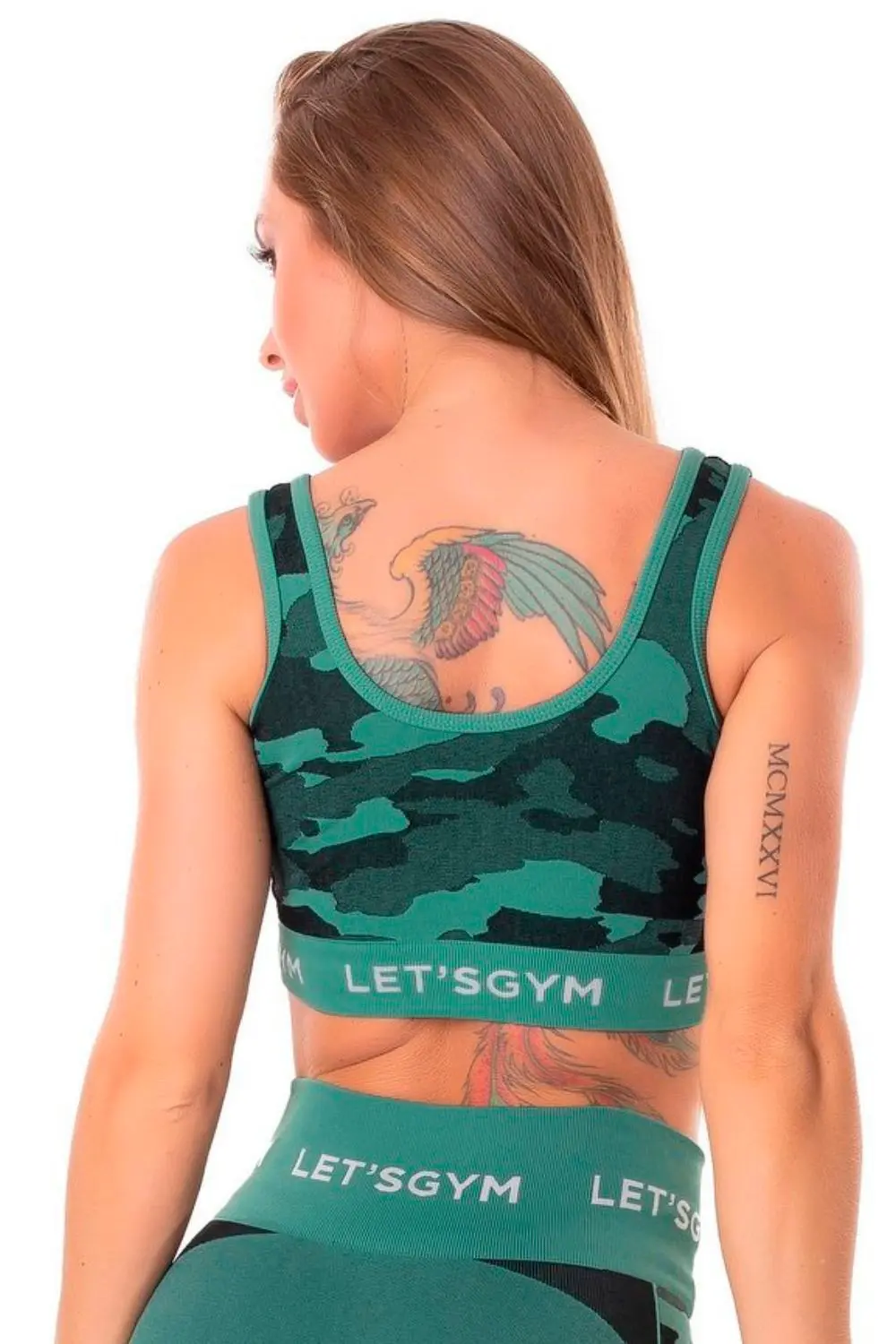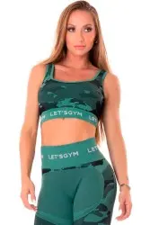 Top fitness feminino com estampa camuflada moderna em tons de verde, modelagem justa que valoriza o corpo e proporciona sustentação ideal para treinos de média intensidade. Possui alças largas, acabamento sem costura e elástico firme com a inscrição "LET'S GYM", garantindo conforto e estilo durante o uso.
