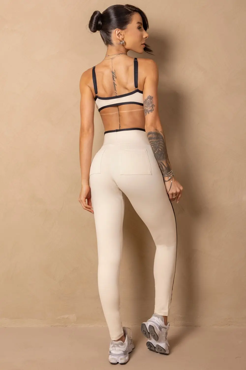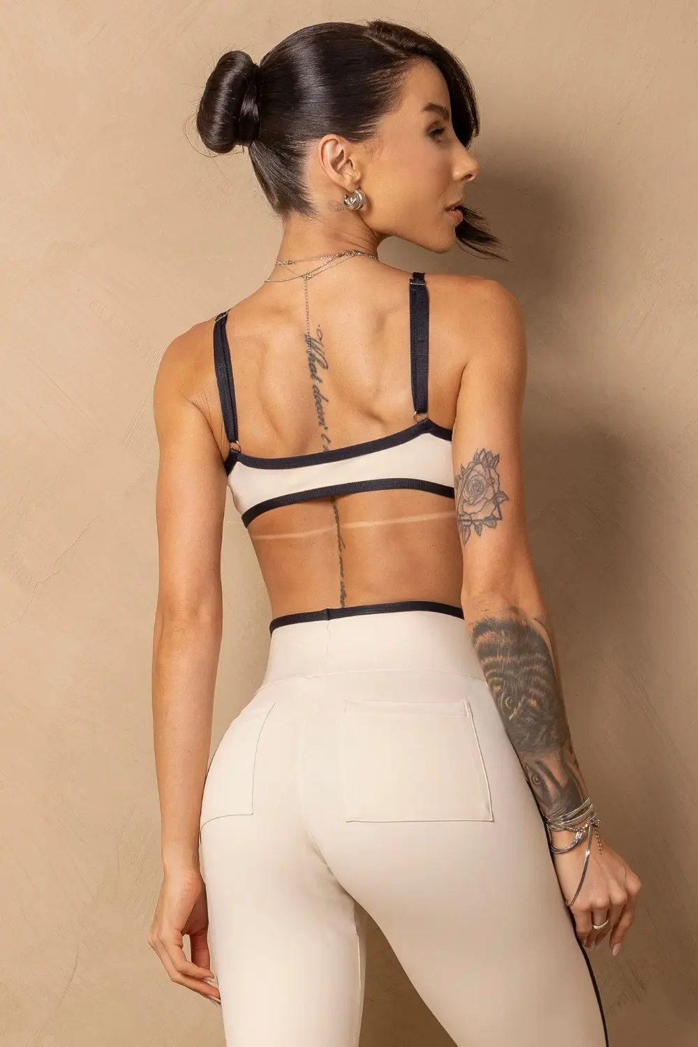 Top Creme com alças finas e acabamento em vivo preto, destacando o design moderno. Possui etiqueta emborrachada frontal com logo, trazendo um toque esportivo. Confeccionado em tecido de alta compressão, garante ajuste perfeito, conforto e sustentação.