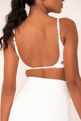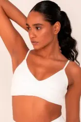 Top com alças finas reguláveis, decote em V e recorte central que valoriza o busto, desenvolvido em tecido de alta elasticidade para máximo conforto e ajuste perfeito ao corpo.
