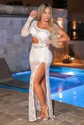 Características: Vestido de renda branca com bojo e hot pant, com recortes na parte de cima e um ombro só.