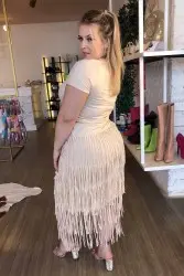 Descrição: O vestido é um estilo boho e descontraído, com as mangas, gola U e comprimento médio. As franjas na saia em malha adicionam um toque de movimento e textura interessante. Este vestido seria perfeito para um dia ensolarado no parque, um festival de música ou um encontro casual. Você pode combiná-lo com sandálias de tiras ou tênis brancos para um look mais descontraído, ou adicionar um cinto fino para definir a cintura e criar um visual mais elegante.