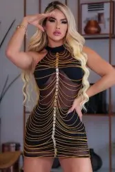 Características: Vestido preto semitransparente com múltiplas finas correntes douradas adornando a parte frontal da peça, além disso a peça também traz short e top por baixo do vestido.