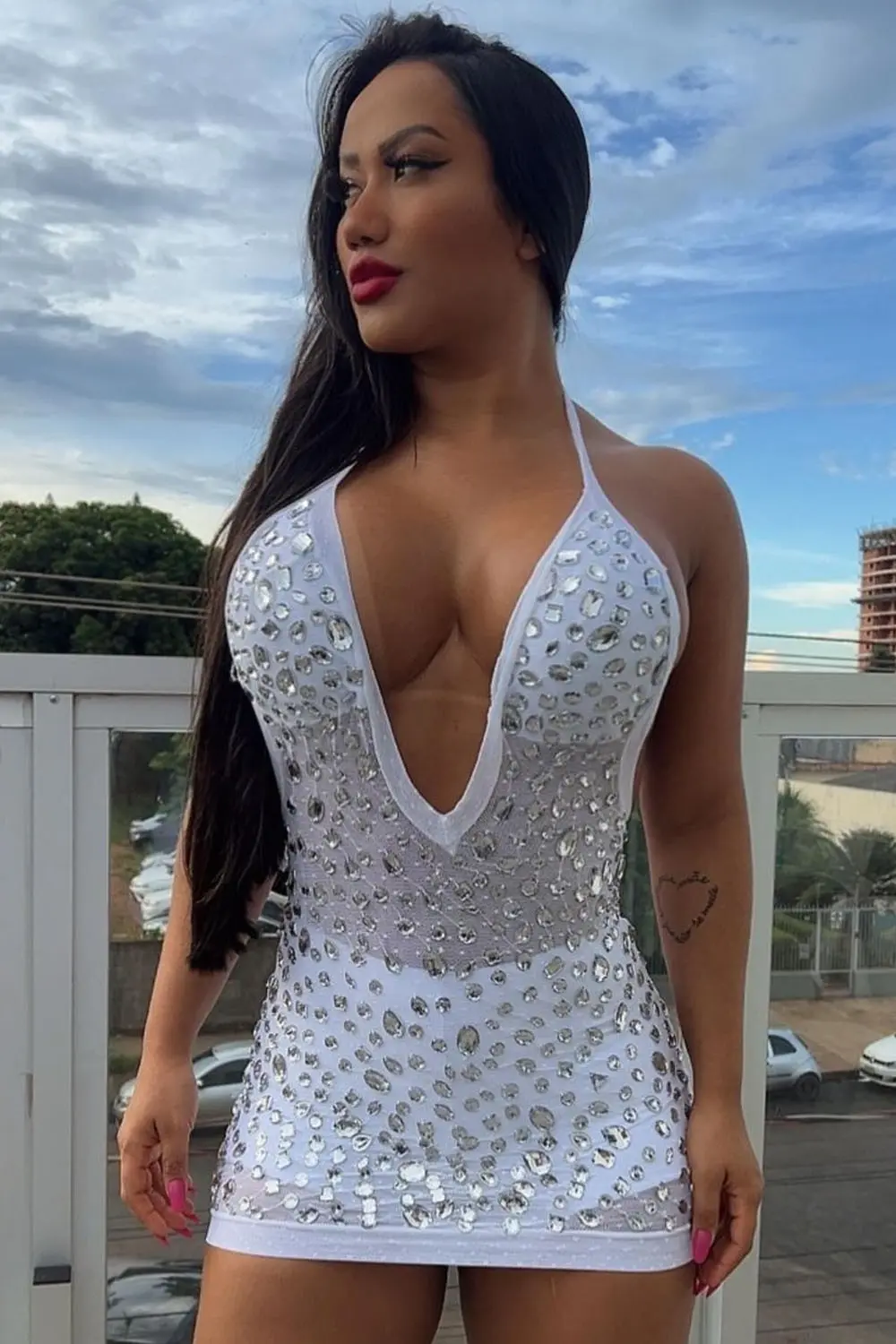 Entre no centro das atenções com nosso elegante vestido branco curto! Feito de tecido semitransparente, este conjunto chique é adornado com atraentes tachas quadradas reflexivas, garantindo que você brilhe em todos os ângulos. O decote largo acrescenta um toque de elegância, enquanto o vestido vem completo com um par de shorts combinando para maior conforto e confiança.