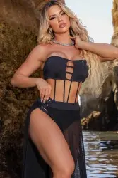 O vestido Tyla Black é modelo diferenciado. Ele é longo, com abertura nas pernas, costas e barriga, além de ser tomara que caia.