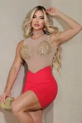O vestido é curto, com uma saia vermelha justa que realça as curvas. A parte superior é em tecido transparente nude, adornada com detalhes dourados em formato geométrico que cobrem o busto e criam um visual glamouroso. O design combina sensualidade e elegância, ideal para ocasiões sofisticadas e marcantes.