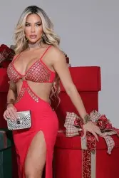 O vestido Deborah é longo, de um vermelho vibrante, com detalhes dourados que agregam sofisticação. Os recortes na cintura valorizam a silhueta e a fenda lateral alta, confere alta sensualidade ao look. O design é moderno e ousado, ideal para ocasiões festivas.