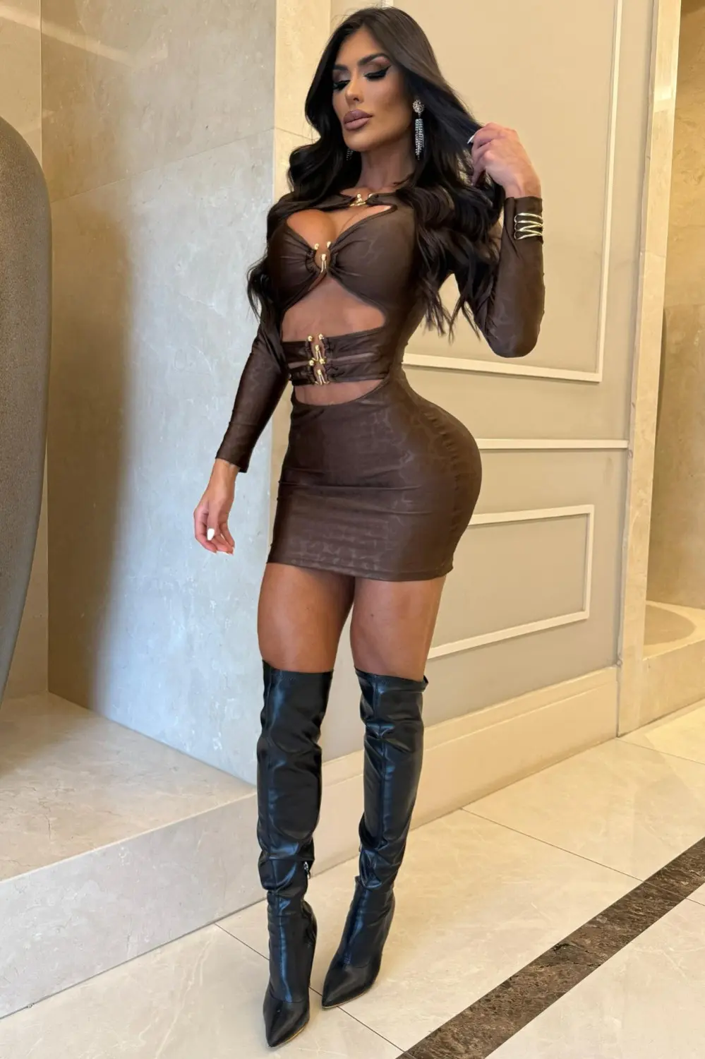 Vestido curto em tecido acetinado marrom, com modelagem justa ao corpo. Possui recortes estratégicos na região do abdômen, decote torcido e detalhe de argolas douradas que conectam as partes superiores e inferiores da peça. As mangas são longas e o caimento valoriza a silhueta com um toque sensual e sofisticado. Ideal para ocasiões noturnas ou eventos especiais.