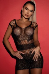 Vestido arrastão preto com detalhes rendados e aplicações de strass, que destacam a silhueta com sensualidade e sofisticação. Possui recortes estratégicos e alças com efeito vazado, ideal para momentos marcantes e ousados.