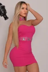 Vestido curto tomara que caia em tecido de alta elasticidade, com modelagem justa que realça as curvas. Possui choker com pedrarias aplicadas e detalhe combinando na cintura, garantindo um visual elegante e marcante.
