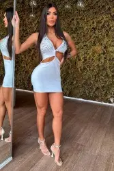 Vestido curto com modelagem justa, destacando recortes frontais e laterais que valorizam a silhueta. O busto possui aplicação de pedrarias em desenho ondulado, trazendo brilho e sofisticação. Uma peça moderna e impactante para produções noturnas.