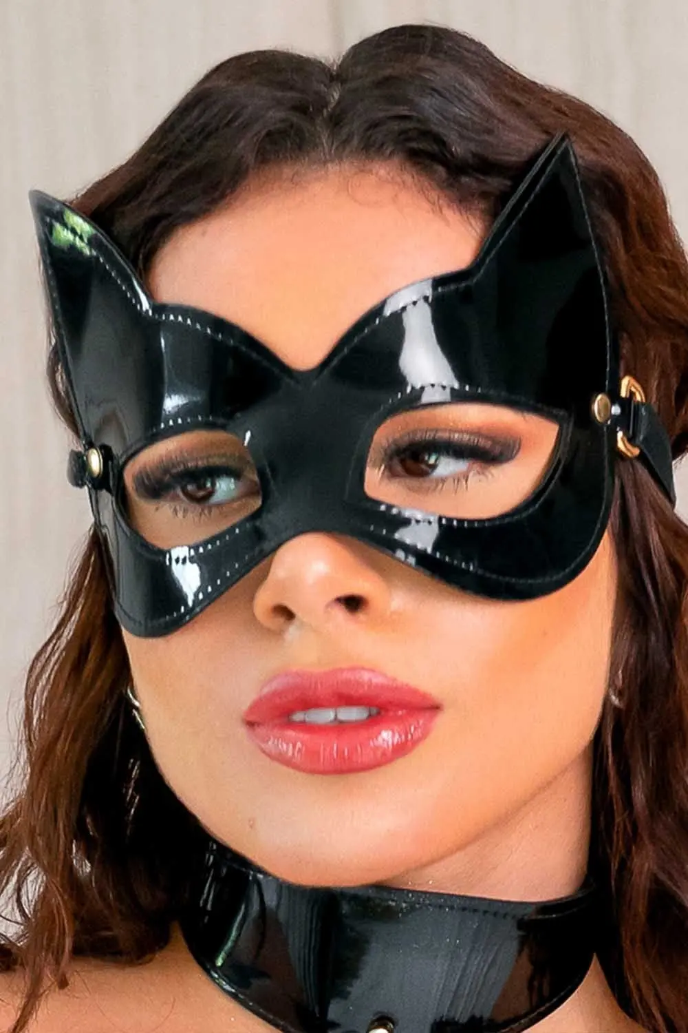 Characteristics: Leather cat mask. Made of faux leather and leather lining. With adjustment and details in golden rivets.