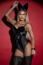 Sensual black velvet bodysuit with strategic tulle transparency, which enhances the silhouette with elegance and boldness. It has a structured cup, thin straps and a satin bow detail at the waist, creating a striking and provocative look. Ideal for special moments with a touch of sophisticated fantasy.