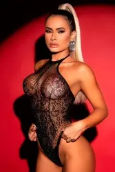 Awaken your sensuality with this black lace bodysuit, with a low-cut design and halter neckline. The strategic transparency and discreet shine of the details make this piece perfect for special occasions, with a bold and elegant touch. Ideal for those who want to make an impact with sophistication.