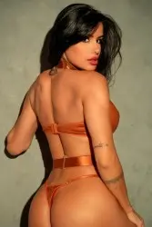 satin bodysuit with strategic cutouts and gold metal hoop details. The modern and sensual design includes a high collar and adjustable straps, highlighting the silhouette in an elegant and bold way.
