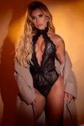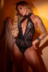 Black lace bodysuit with a sophisticated design, a deep V-neckline, and a high lace collar. Strategically sheer, curve-flattering cutouts, and adjustable straps at the waist add sensuality and elegance in a single piece.