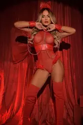 This themed lingerie is an elegant and provocative piece, ideal for those seeking a sensual look with a playful touch. Made of sheer white tulle, it features a fitted design that enhances curves and strategic cutouts that highlight the silhouette. The design features a high neckline and metallic detailing at the front, adding sophistication to the look. At the bottom, delicate feather appliqués on the sides add a special charm and unique finish. It comes with accessories such as a headband with ears and cuffs, completing the fantasy with style and sensuality. A perfect choice for moments of seduction and fun.