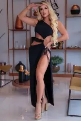 Features: A bold black dress with a neckline crossed with thick straps, leaving decorative a cutout under the bust, that also covers part of the abdomen, back and hips , as well as a long decorative cutout over the left leg, as well as an additional round buckle on left side of the hips.