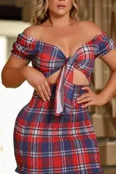 Red plaid stretch dress, made of crepe fabric. The skirt and sleeves are entirely made of stretch, with tie-up details at the front, allowing you to adjust the double neckline. It has no padding, offering a comfortable and stylish fit.