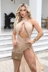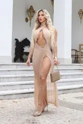 Be dazzled by this nude dress that combines sophistication and sensuality in just the right measure! With a design that enhances your curves, it has a crossover neckline that exudes elegance, strategic cutouts at the waist for a modern touch and a high slit that guarantees a walk full of attitude. The fluid pleated fabric adds lightness and movement, while the metallic details bring a sophisticated shine to the look. Ideal for events where you want to be the center of attention and leave your mark wherever you go. Be unforgettable!