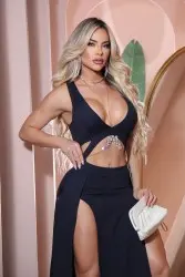 Turn heads with our striking black dress! This vibrant piece boasts a wide neckline for a touch of elegance, while its various decorative openings add a hint of allure, highlighting your abdomen, hips, and thighs. Embrace the dynamic energy and showcase your legs in style with this daring and fashionable black dress.