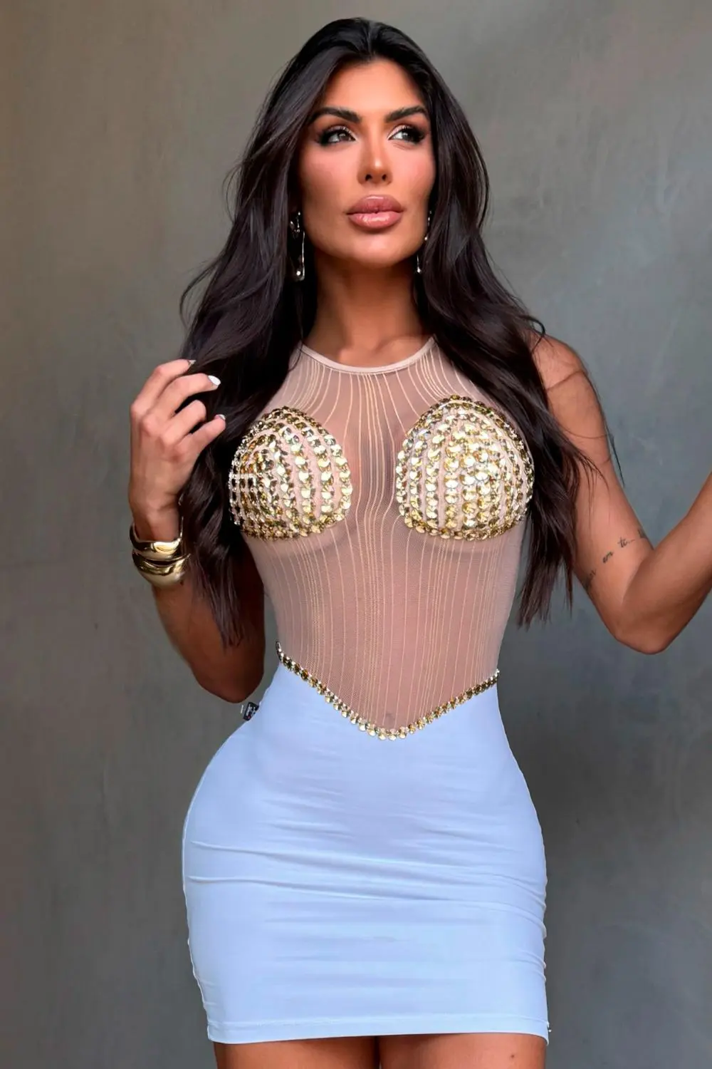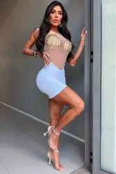 Short dress with a nude tulle top and gold beaded appliqués on the bust, adding sparkle and emphasis to the look. The plain white skirt balances the look, while the rhinestone detail at the waist adds a glamorous touch. Perfect for events where the look takes center stage.