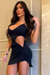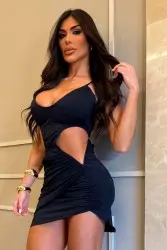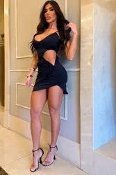 Short dress with a fitted silhouette, side cutouts that accentuate the waist, and draped detailing that highlights curves. Features a deep neckline and a modern single strap, creating a bold and sophisticated look. Ideal for impactful evening outfits.