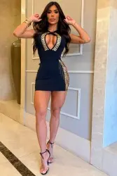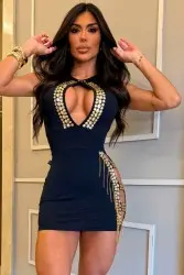 Short dress with a front cutout and gold chain and gemstone embellishments that accentuate the neckline and waist. A fitted design that highlights curves and a sparkly side detail for a striking and elegant look.