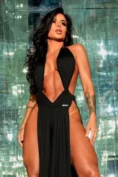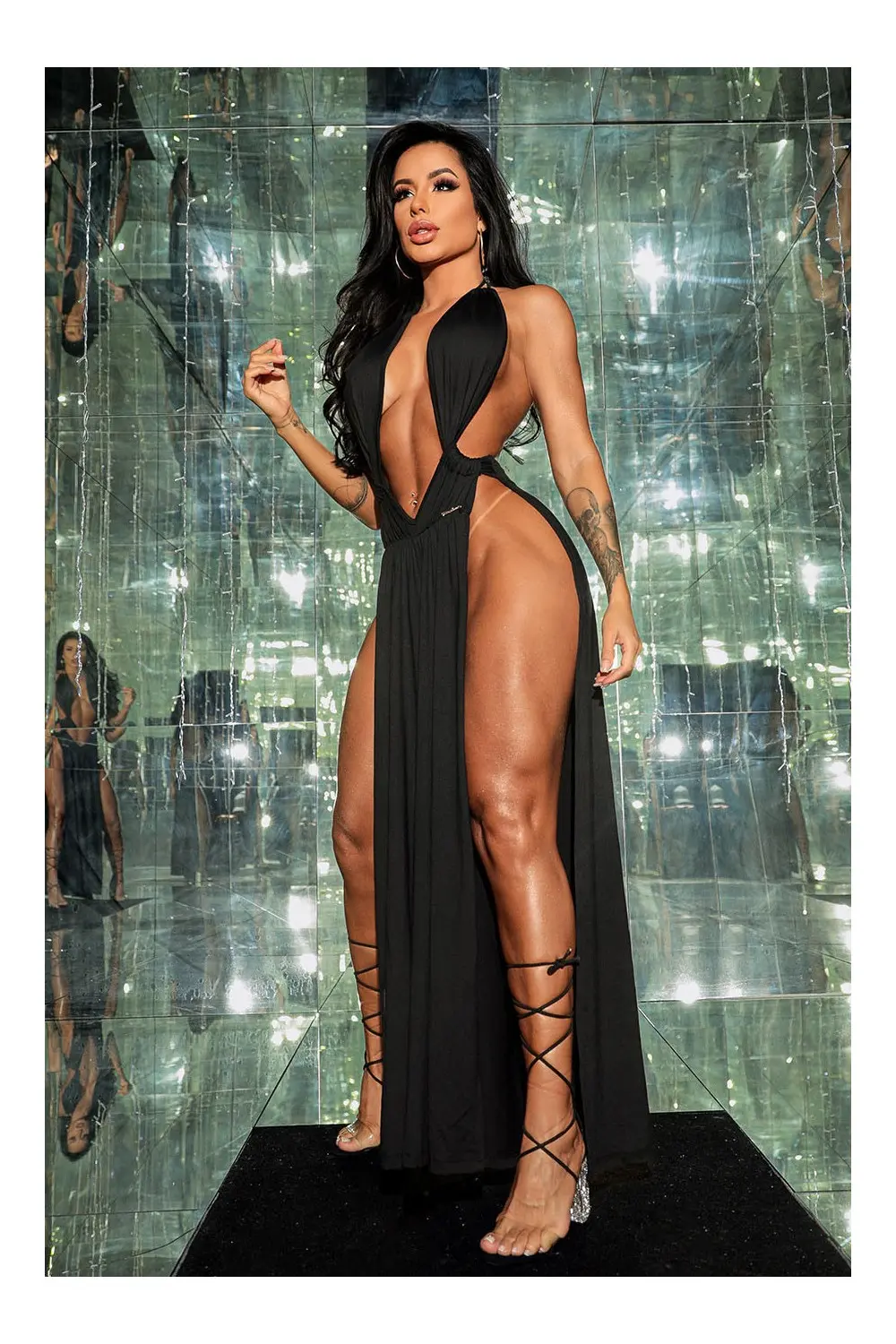 Features: Black jumpsuit with slits, low-cut at the top and open at the back.