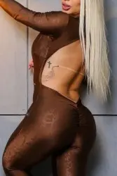 Brown cirrê jumpsuit with a slight sheen and embossed animal print. Fitted to the body, with a plunging neckline and a fully open back, enhancing the silhouette. Ideal for bold and sophisticated looks.